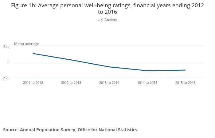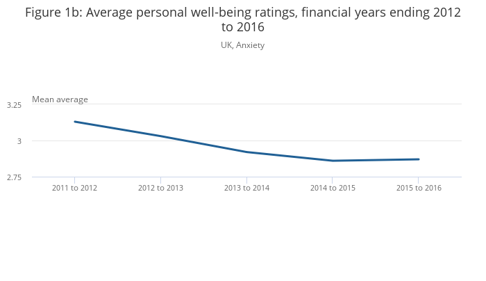 Reported personal well-being had improved every year since the financial year ending 2012, when data were first collected; however, the financial year ending 2016 sees the first instance where there has not been an annual improvement across all of the measures.