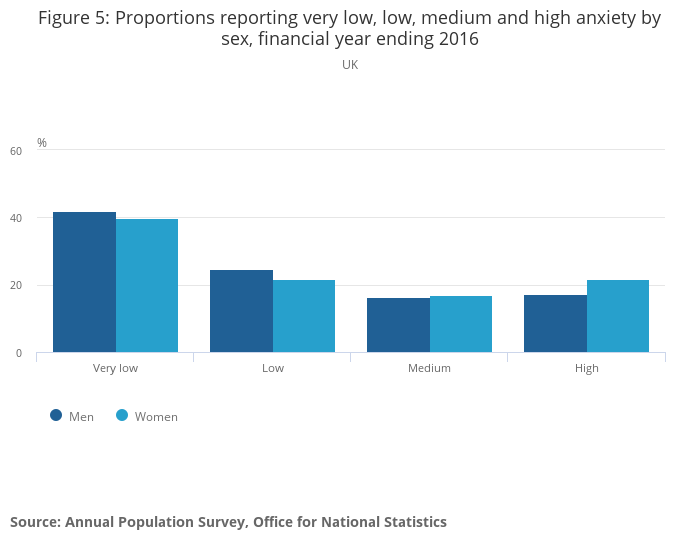 Figure 5: Proportions reporting very low, low, medium and high anxiety by sex, financial year ending 2016