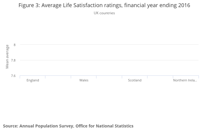 Northern Ireland also had the largest absolute increase in average ratings of life satisfaction of the UK countries (7.5 to 7.9) between the financial years ending 2012 and 2016.