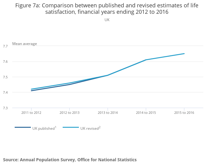 Figure 7a: Comparison between published and revised estimates of life satisfaction, financial years ending 2012 to 2016