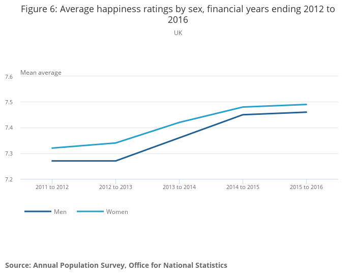Figure 6: Average happiness ratings by sex, financial years ending 2012 to 2016