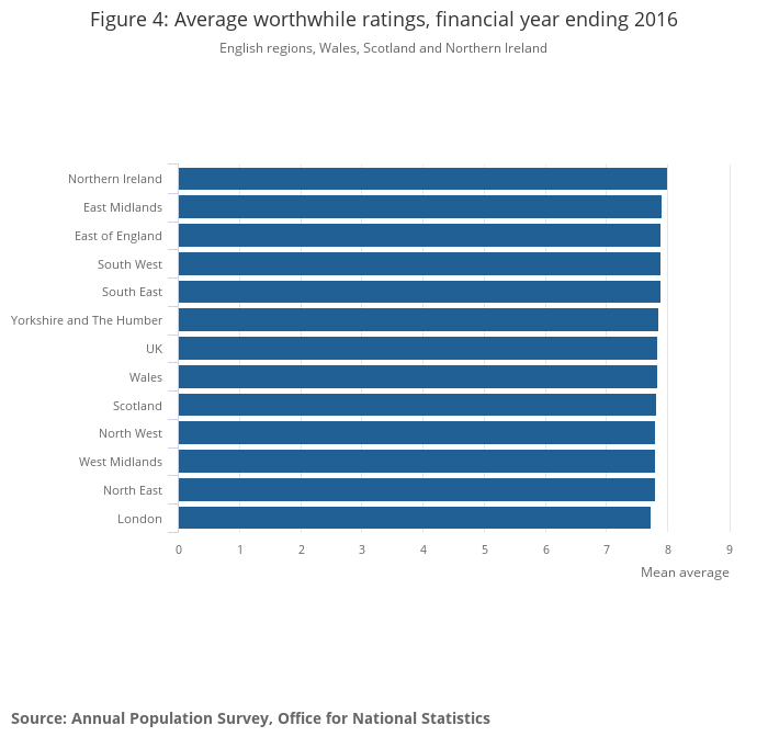 - People in London reported lower worthwhile ratings than UK overall