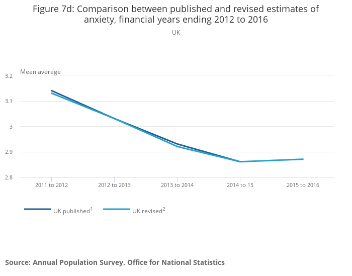 Figure 7d: Comparison between published and revised estimates of anxiety, financial years ending 2012 to 2016