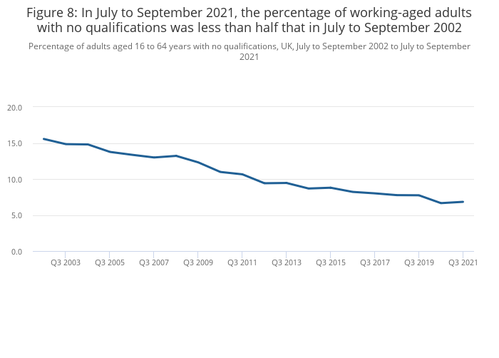 In July to September 2021, 6.8% of adults aged 16 to 64 years were estimated to have no qualifications. This represents a long-term improvement (decrease) from 8.2% in July to September 2016 and is less than half of the percentage reported in July to September 2002 (15.6%).