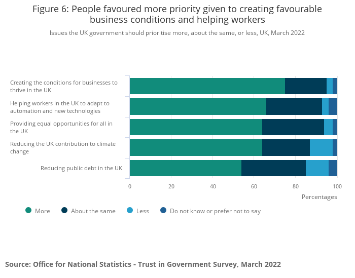 75% of the population believed that the UK government should place a higher priority on creating conditions for businesses to thrive, 64% said they should place higher priority on reducing climate change and 54% believe they should place higher priority on reducing the national debt.