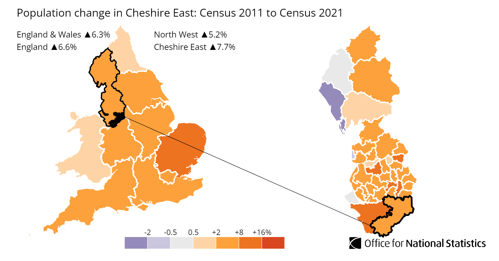 Percentage population change, Cheshire East and surrounding areas, 2011 Census to Census 2021