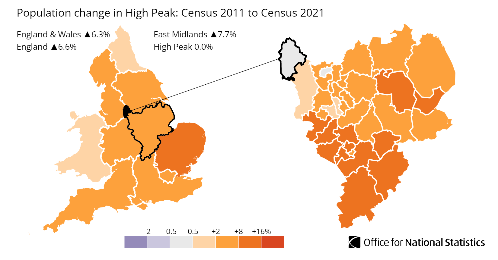 England ▲6.6% East Midlands ▲7.7% High Peak 0.0%| -2 | -0.5 | 0.5 | +2 | +8 | +16% |