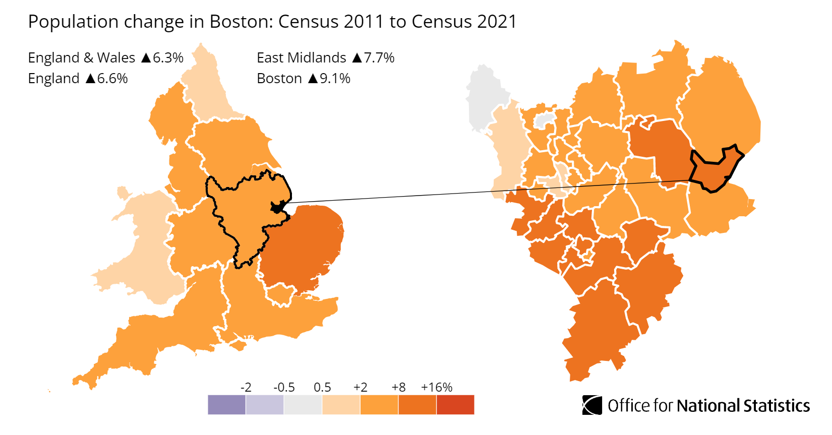 Between the last two censuses (held in 2011 and 2021), the population of Boston increased by 9.1%, from just over 64,600 in 2011 to around 70,500 in 2021.
