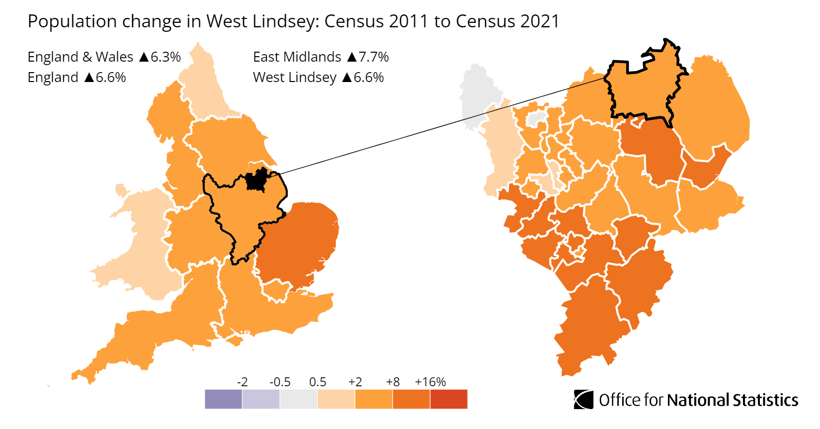 Percentage population change, West Lindsey and surrounding areas, 2011 Census to Census 2021