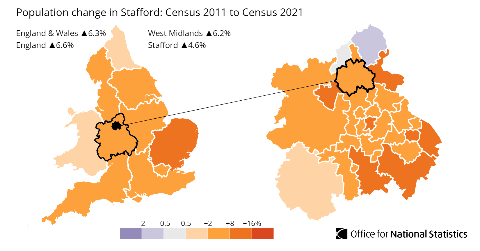 England ▲6.6% West Midlands ▲6.2% Stafford ▲4.6%| -2 | -0.5 | 0.5 | +2 | +8 | +16% |
