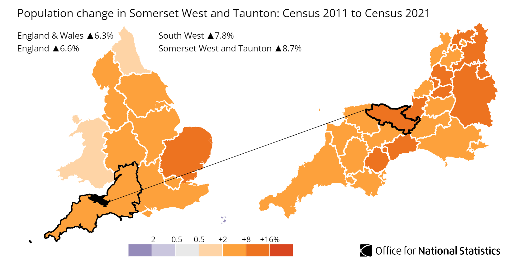 Between the last two censuses (held in 2011 and 2021), the population of Somerset West and Taunton increased by 8.7%, from around 144,900 in 2011 to around 157,400 in 2021.