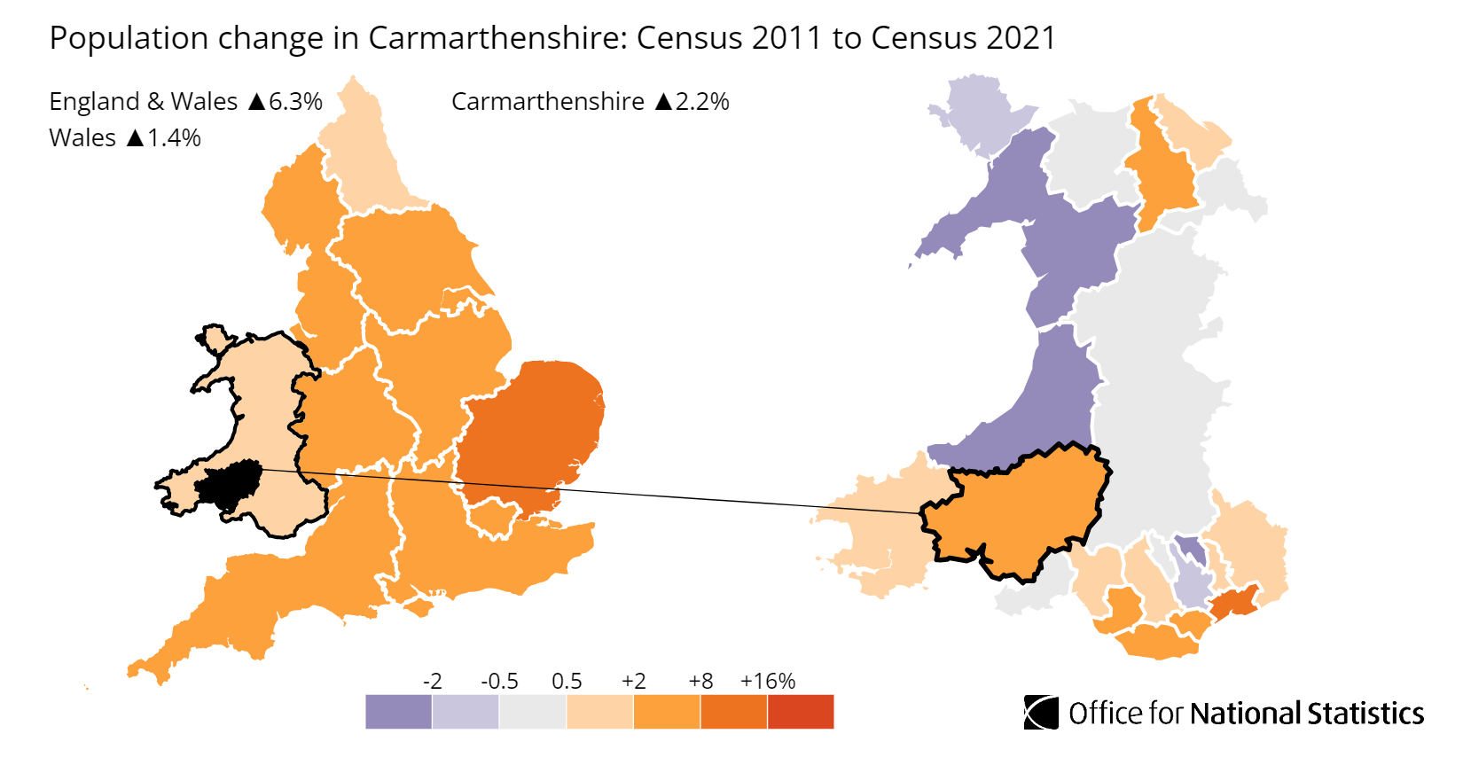 Between the last two censuses (held in 2011 and 2021), the population of Carmarthenshire increased by 2.2%, from around 183,800 in 2011 to around 187,900 in 2021.