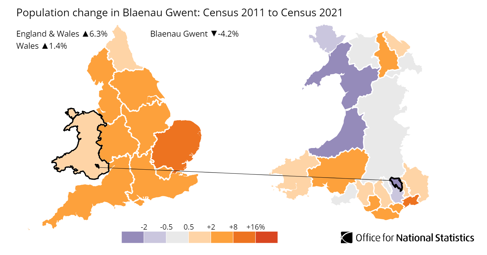 Between the last two censuses (held in 2011 and 2021), the population of Blaenau Gwent fell by 4.2%, from just over 69,800 in 2011 to around 66,900 in 2021.