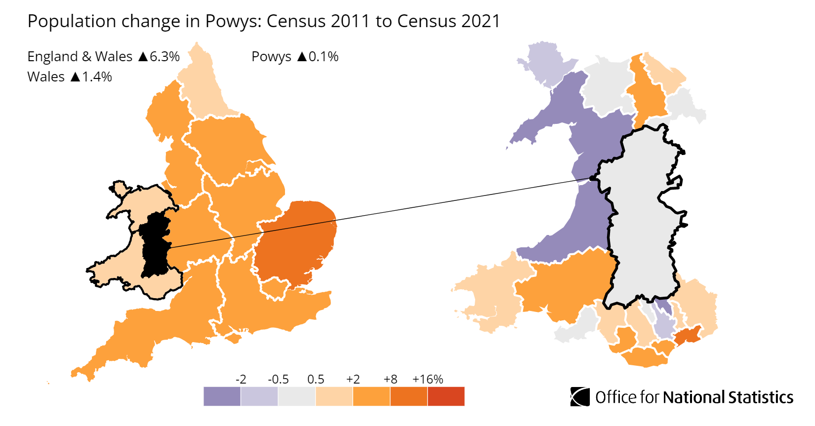 Percentage population change, Powys and surrounding areas, 2011 Census to Census 2021