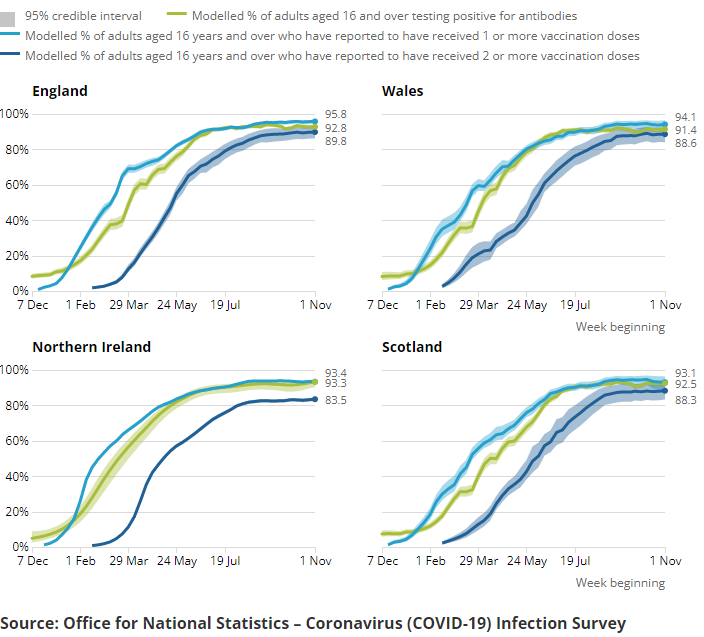 The percentage of adults testing positive for COVID-19 antibodies remained high across the UK in the most recent weeks up to 1 November 2021.