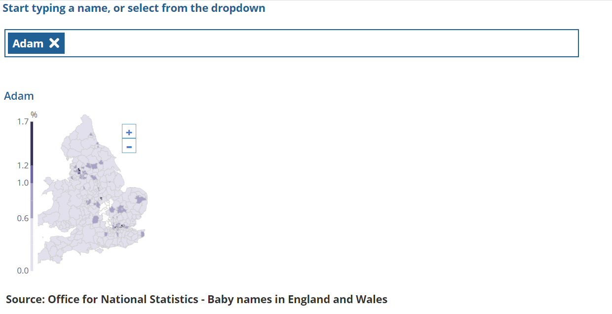 This graphic allows users to see the geographical spread of a selected name across England and Wales. See the accompanying data for the underlying figures.